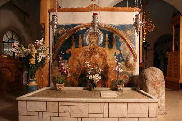 Δίπλα στον τάφο σώζεται η μεγάλη ωοειδής πέτρα, πάνω στην οποία στηρίχθηκε η Αγία, κατά την στιγμή του αποκεφαλισμού της.